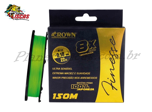 16002 | Linha Crown Finesse 8X Yellow Multifilamento 0,26mm com 150 Metros | Multifilamento | LINHA CROWN FINESSE 8X A linha premium Finesse é desenvolvida totalmente com matéria-prima japonesa, confeccionada com 8 micro fios em 100% PE de alta qualidade. Produzido co... | R$ 94.90 |